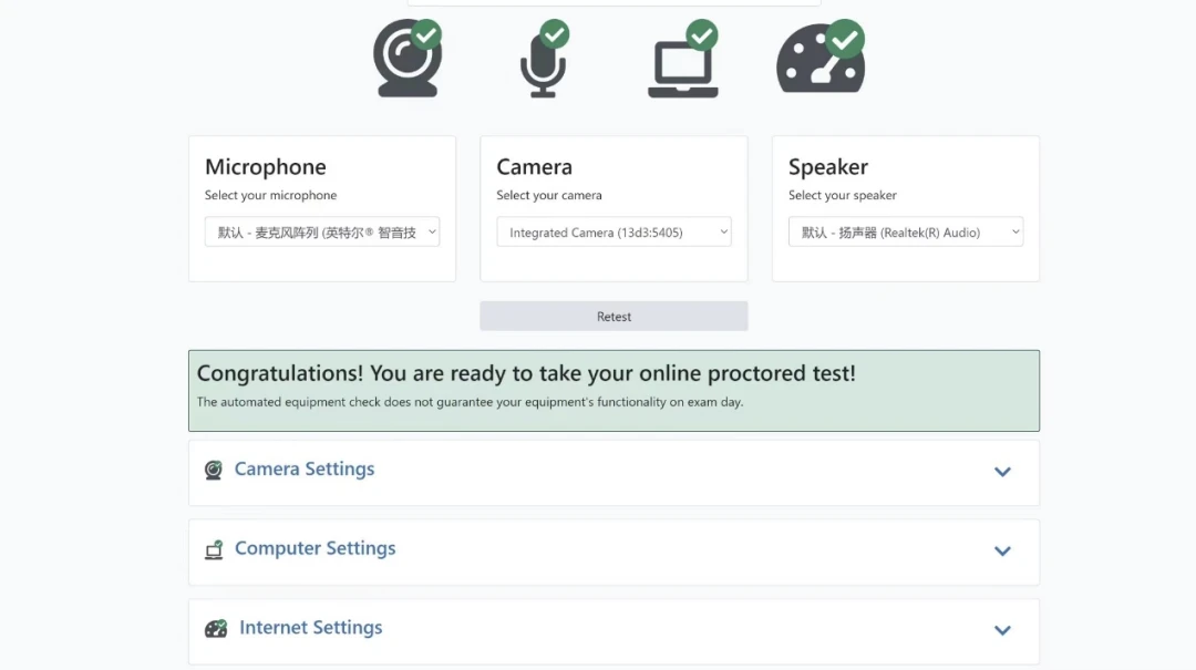 摄像头 | 注意*:禁用任何形式的耳机;可使用内置或外接网络摄像头,摄像头必须可移动以供考官360度检查房间 |