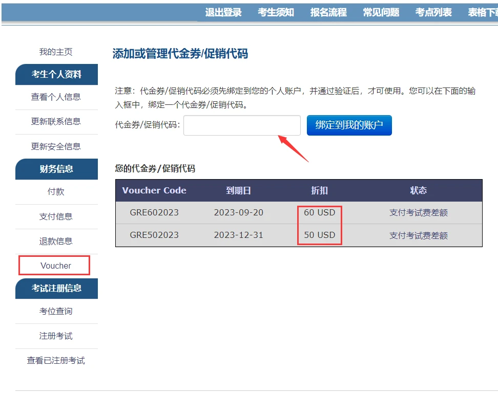 使用方式:登录你的GRE账号,在主页左侧点击Voucher,添加折扣码即可享受优惠!