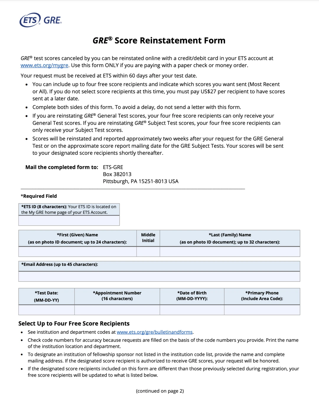 如果 ETS 在考试日期后 60 天内收到您的申请,被取消的分数可以恢复,需要传真或邮寄一份完整的分数恢复表(需要填写个人信息、考试日期和注册号),并支付$50。