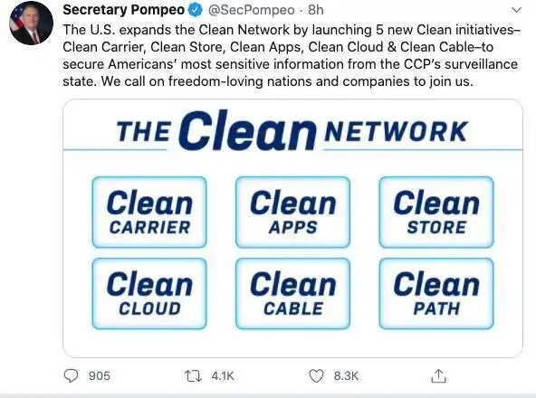 这一系列的制裁背后都少不了美国国务卿蓬佩奥(Mike Pompeo)这个老江湖的操作,近日他公开发表了Press Statement表示将开展“净网行动”(clean network)。