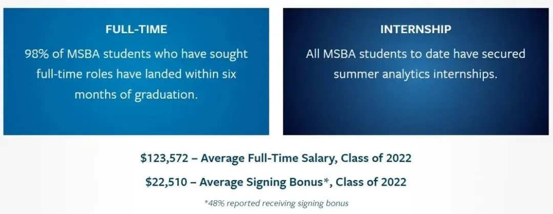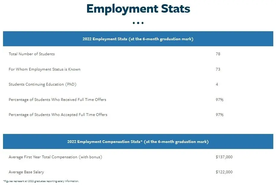 BA 项目毕业生的平均起薪达 $123,572,平均签约奖金 $22,510。就业表现同样亮眼,98% 的学生在毕业6个月内成功就业,展现了极强的就业竞争力。