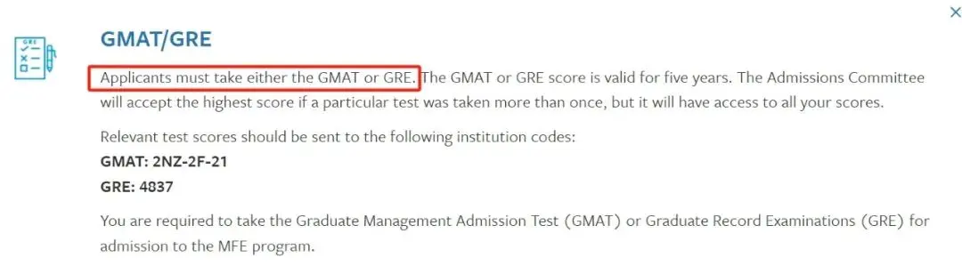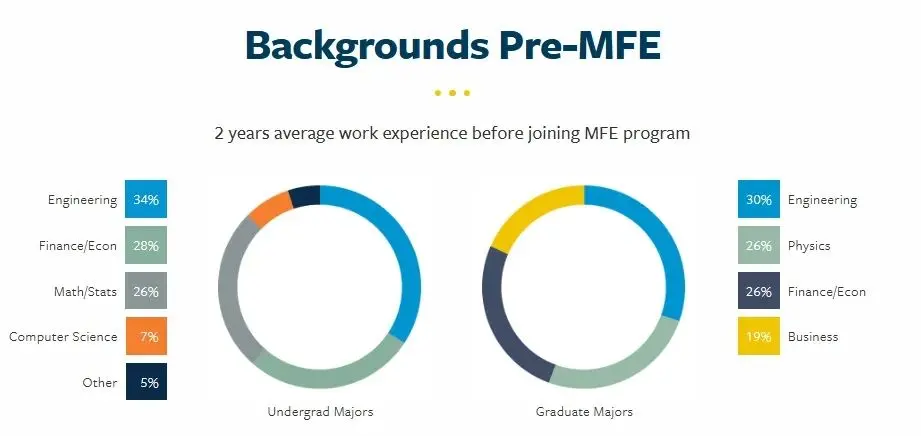 MFE项目录取学生的GRE中位分数为:Verbal 158分, 数学169分。录取学生平均GPA为3.5,专业背景多为工程相关。