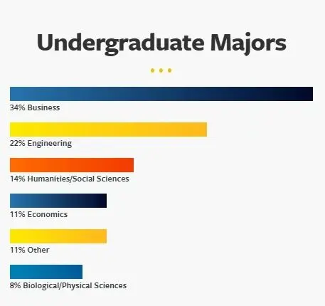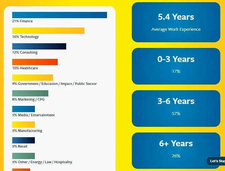 MBA项目非常看中工作经验,学生的平均工作时间为5.4年,行业背景多为金融、科技以及咨询领域。