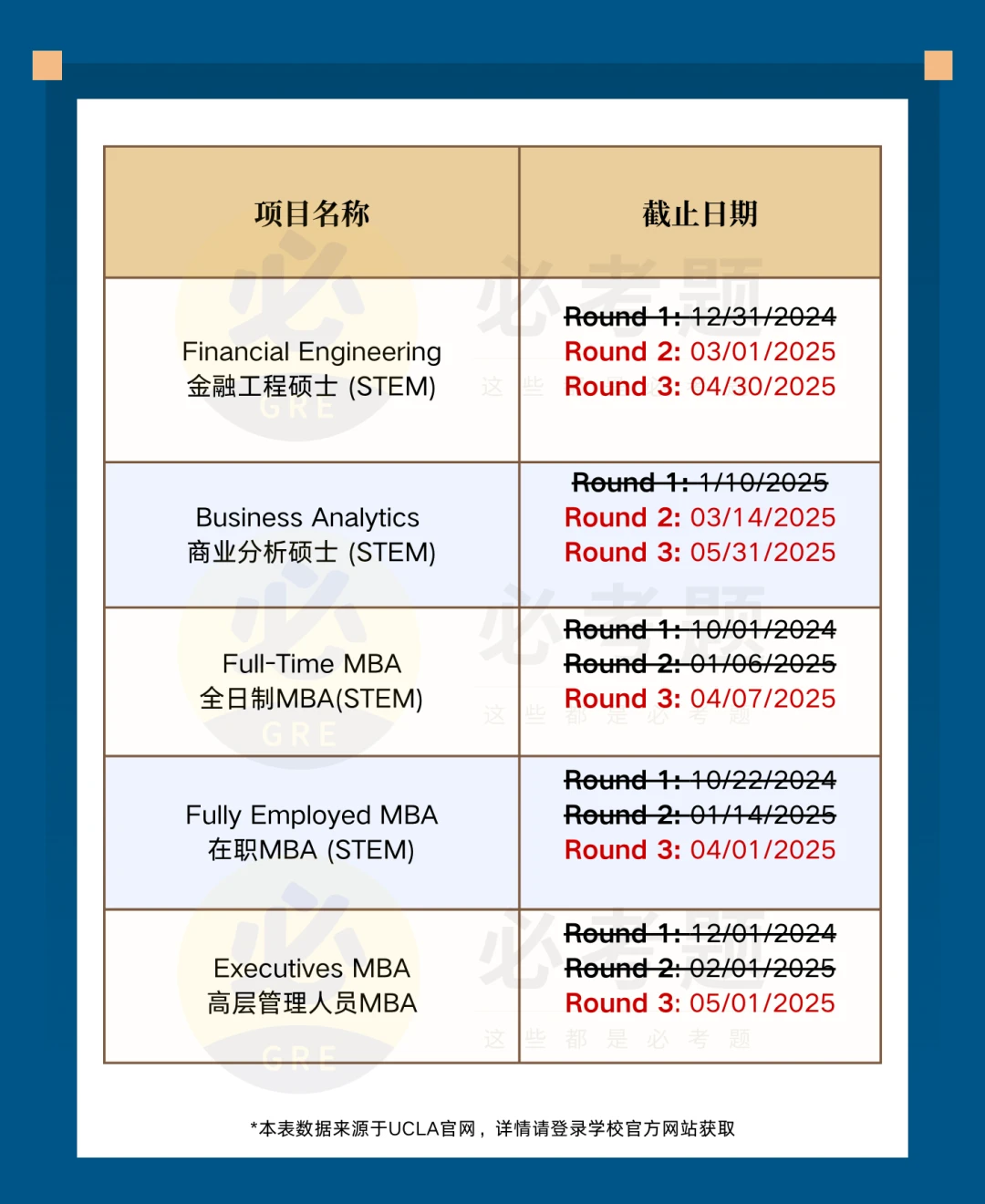 我们也为大家详细整理出了UCLA安德森管理学院各个项目的申请截止日期和GRE要求,以便同学们能够有效地安排申请计划: