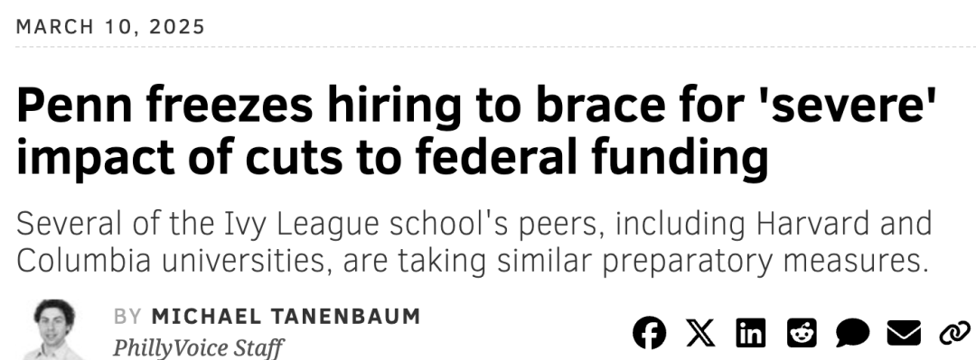 3月10日,宾大宣布将冻结大部分教职员工的招聘,以应对预期中的联邦资金削减。