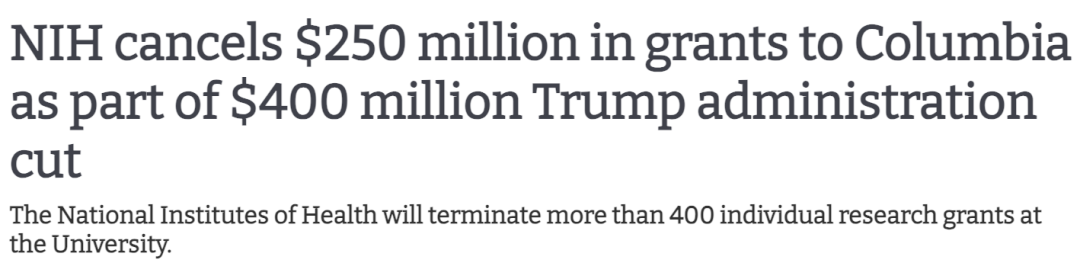其中,NIH宣布终止向哥大提供2.5亿美元资助,涉及400多个研究项目。这笔资金原本用于支持该校的医学和生命科学研究项目,也是此次巨额拨款削减的一部分。