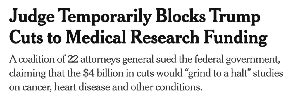 此外,美国22个州及多所顶尖大学、医院和研究机构就特朗普政府大幅削减NIH经费的决定提起诉讼,认为这将对医学研究和公共卫生产生不利影响。联邦法官已暂时阻止该政策的实施,案件正在审理中。