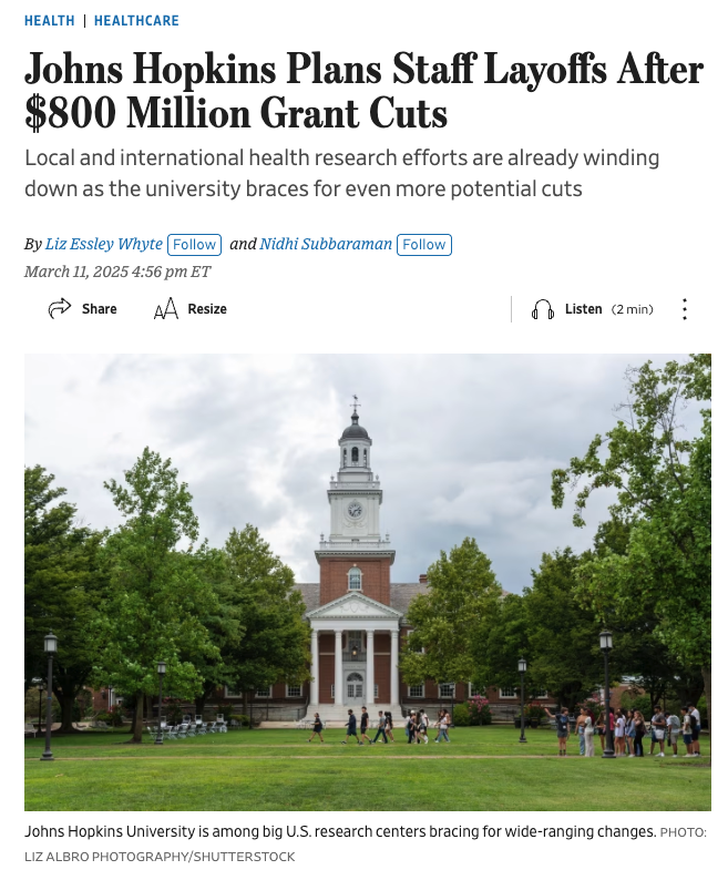 校方表示,由于经费大幅削减,将会导致JHU关键项目的缩减和大量职位流失,特别是在全球健康领域。