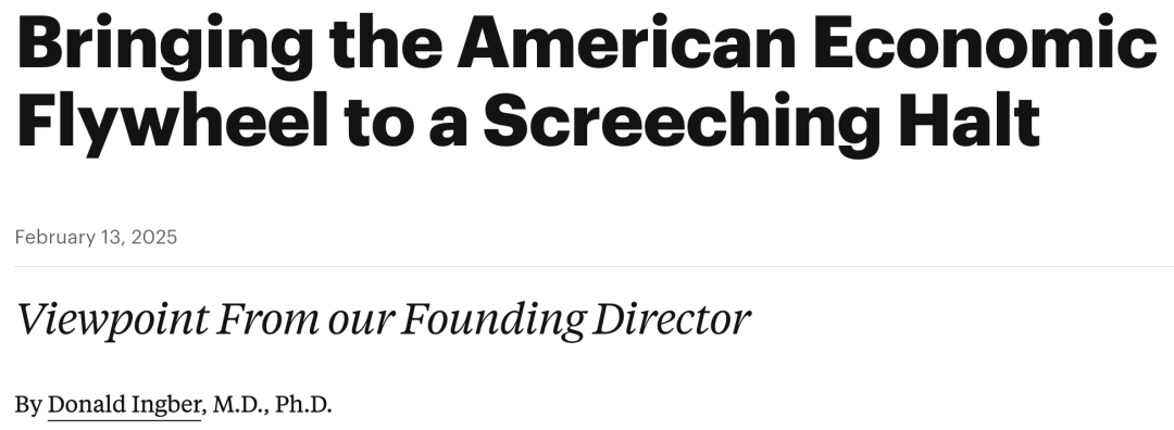 哈佛Wyss生物启发工程研究所的创始主任Donald Ingber发文《让美国经济飞轮戛然而止》,表示NIH的大幅资金削减,会对全美研究型大学和医学中心造成巨大冲击,削弱美国在全球技术领域的领导地位。