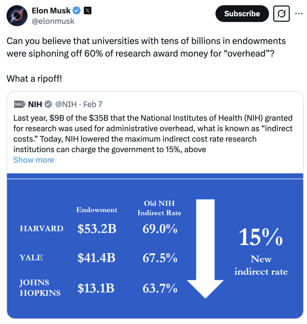马斯克:“你敢信?那些拥有数百亿美元捐赠基金的大学,竟然从研究经费中抽走了60%作为运转资金?简直离谱!”
