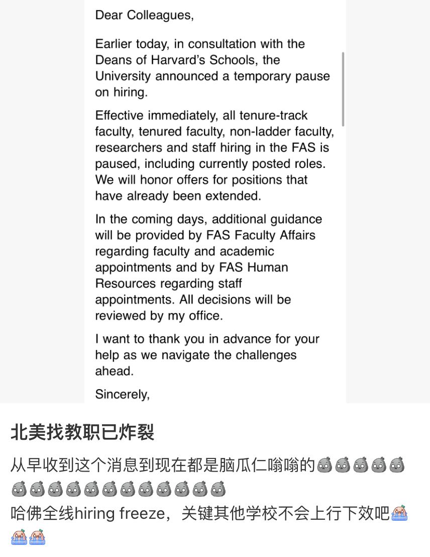 哈佛暂停教职招聘的决定也让许多博士生感到担忧。教职岗位的减少意味着学术就业市场的竞争将更加激烈,博士生的职业前景也因此蒙上了一层阴影。