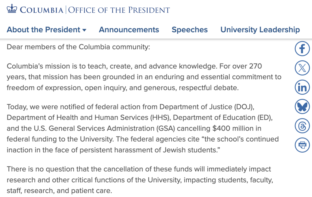 面对政府的“撤资”决定,各大高校也迅速做出反应。哥大、JHU等受影响的学校纷纷发表声明,强调资助对科研和教育的重要性。